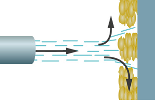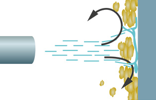 NON ABRASIV. Schnell und effizient. Ab 0.1 bar Druck. Dabei fallen keine Sekundär-Abfälle an, denn das Reinigungsmittel ist ausschließlich kalte Trockendruckluft und diese löst sich bei der Reinigung buchstäblich in Luft auf.